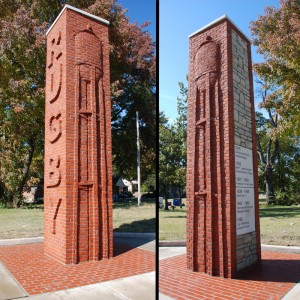 Two large columns serve as the gateway into Rugby Gates, a public art project in Memphis designed by Gregg Schlanger. (Photo by Greg Schlanger)