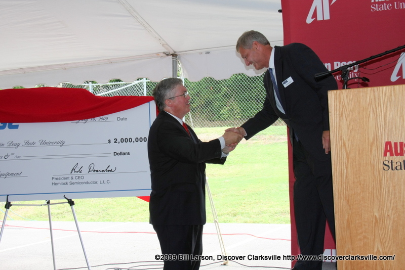 In addition to comments by local and state dignitaries, Rick Doornbos, president and CEO of Hemlock Semiconductor Group, presented a $2 million check to APSU to purchase laboratory equipment for the building.