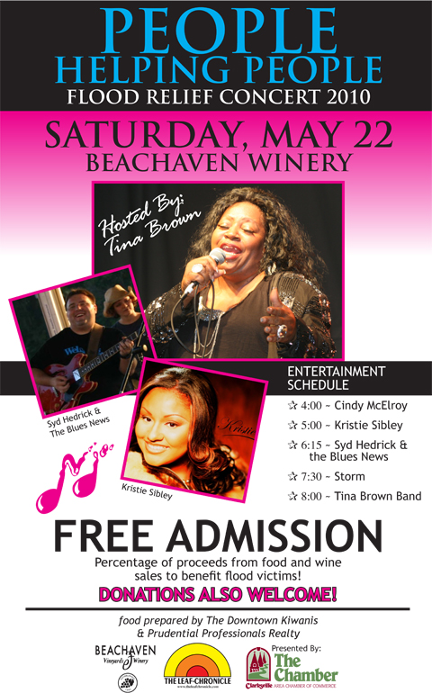 The Clarksville Area Chamber of Commerce has organized a benefit concert to assist the victims of the recent flood. “People Helping People” will take place Saturday, May 22nd, 2010 from 4:00 pm until 9:30 pm at Beachaven Winery & Vineyards. The concert is free and open to the public, however donations are welcome.