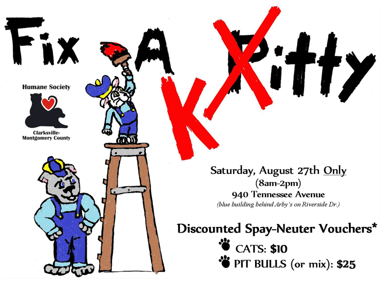 Clarksville, TN – On Saturday, August 27th from 8:00am to 2:00pm, the Humane Society of Clarksville-Montgomery County will be utilizing a grant to provide our community with very reduced spay-neuter rates for Cats and Pit Bulls (or mixes) only.
