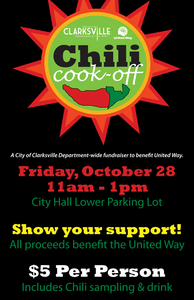 Clarksville, TN – This Friday, October 28th, 2011, from 11:00am to 1:00pm, the City of Clarksville will host its annual department-wide Chili Cook Off to benefit the United Way. The event will take place in the lower level employee parking lot at City Hall located at One Public Square.