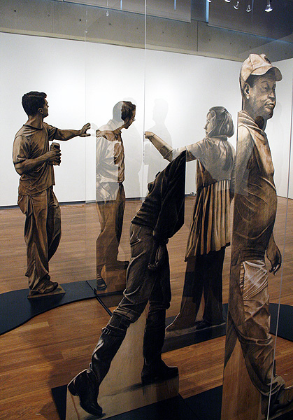The installation size is approximately 8’W x 16’L x 8’H, and contains eleven full scale charcoal portraits on cut-out plywood, mounted on black floor stands. Two sheets of Plexiglas are sandwiched between emerging and disappearing people.