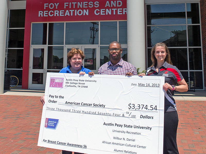 Henderson Hill III (center), director of the Wilbur N. Daniel African American Cultural Center at APSU, and Lauren Wilkinson (right), assistant director of the APSU University Recreation, present a check to Jerri Rule, community representative with the American Cancer Society. The proceeds are from the annual Breast Cancer Awareness 5K held April 13th on the main APSU campus. (Photo by Beth Liggett, APSU photographer)