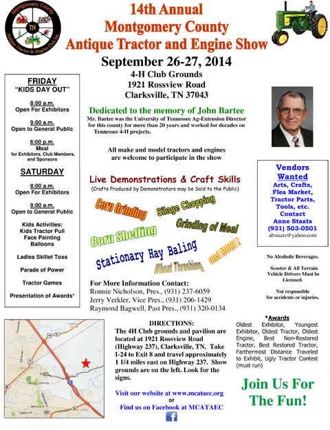 Clarksville, TN – On September 26th-27th, 2014, the Montgomery County Antique Tractor and Engine Club will hold the 14th Annual Montgomery County Antique Tractor and Engine Show at the 4-H Club Grounds. Admission to the event is free.