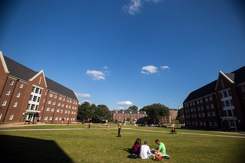 Students hang out on the quad between residence halls Eriksson, and Governors Terrace North and South at Austin Peay State University.