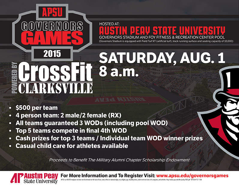 Clarksville, TN – In honor of the military students and their families who help make Austin Peay State University strong, the 2015 APSU Governors Games Powered by CrossFit Clarksville will benefit the APSU Military Alumni Chapter Scholarship Endowment.