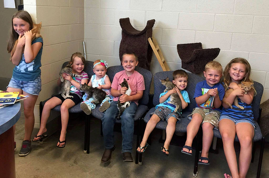 Children holding cats and kittens during story reading at Montgomery County Animal Care and Control.
