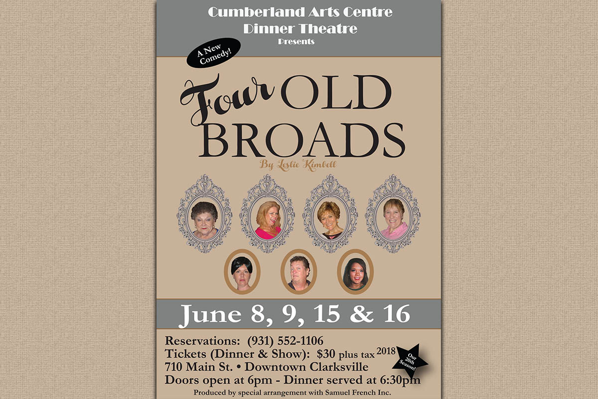 Clarksville, TN – “Four Old Broads”, a new comedy by Leslie Kimball, opens this weekend at the Cumberland Arts Centre Dinner Theatre. The comedy is set at Magnolia Place, an upscale retirement home.