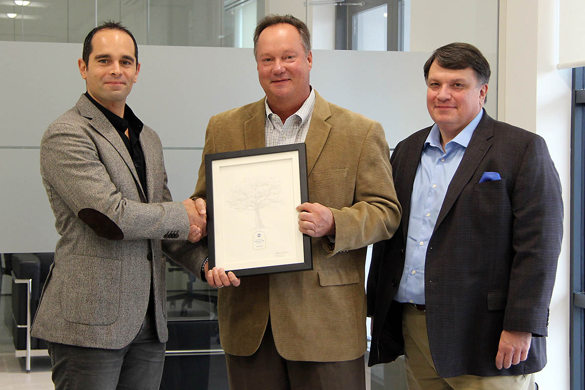Florim USA CEO Marco Fregni (left) and Florim USA Environmental Manager Don Haynes (right) receive the 2017 Tennessee Valley Authority Carbon Reduction Award from Cumberland Electric Membership Corporation General Manager Chris A. Davis (center).