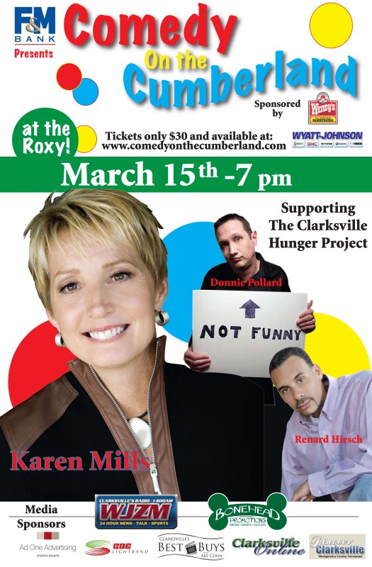Clarksville, TN – The next Comedy on the Cumberland show is set for Tuesday, March 15th at 7:00pm at the Roxy Regional Theatre. The show will feature the very funny Karen Mills, who headlines a line-up of some of the funniest comedians working today. “I was referred to Karen Mills by the last shows headliner Henry Cho, and if he thinks she’s funny, then she’s funny”, said Hank Bonecutter.