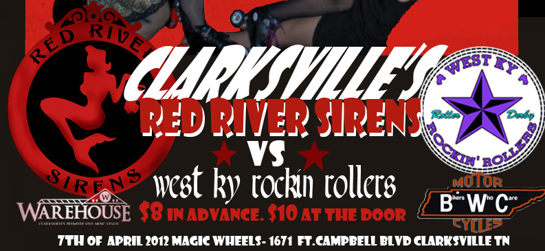Clarksville, TN – Please join Clarksville Roller Derby’s Red River Sirens as they take on Nashville Roller Girls Brawl Stars on June 8th, 2013. Doors open at 6:00pm, whistle blows at 7:00pm at Magic Wheels Skate Center, 1671 Fort Campbell Boulevard, Clarksville, TN.