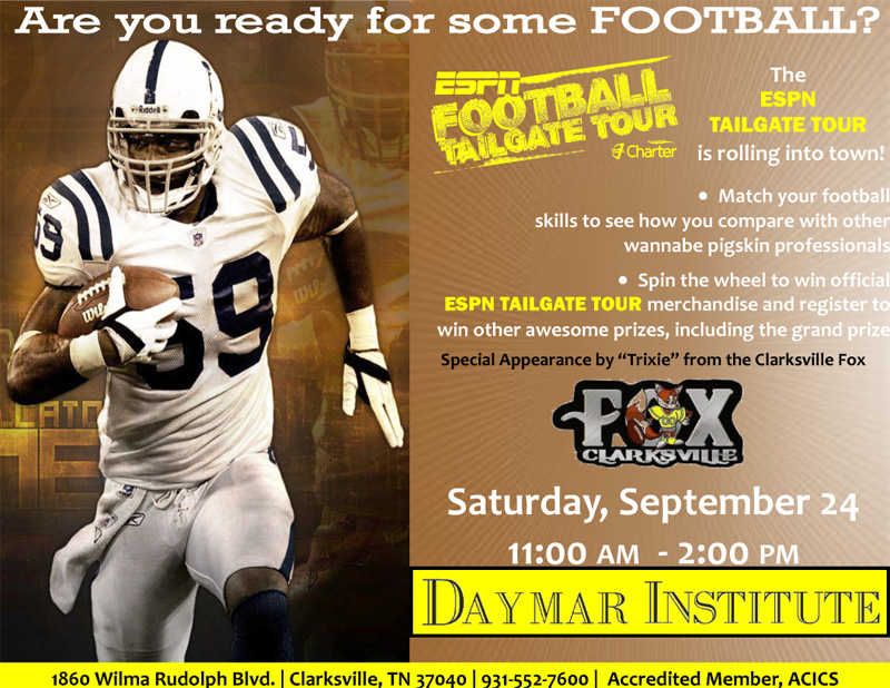 Clarksville, TN – Daymar Institute and Charter Media proudly invite the community to come out and join in the football festivities as they bring the ESPN Tailgate tour to Clarksville for the first time ever!